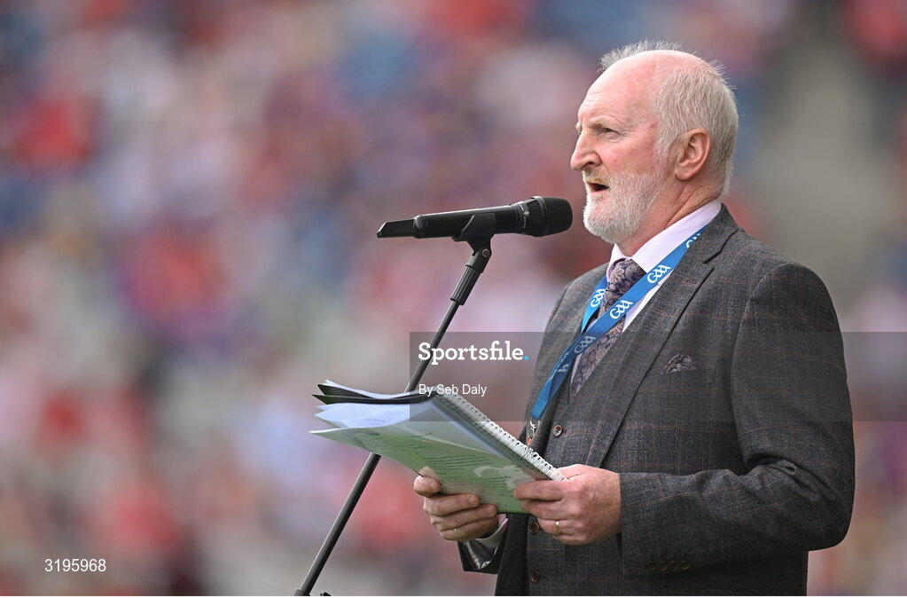 20 July 2025; MC Mac Dara Mac Donncha introduces the 2000 All-Ireland winning Kilkenny hurling jubilee team who were honoured before the GAA Hurling All-Ireland Senior Championship final match between Cork and Tipperary at Croke Park in Dublin. Photo by Seb Daly/Sportsfile