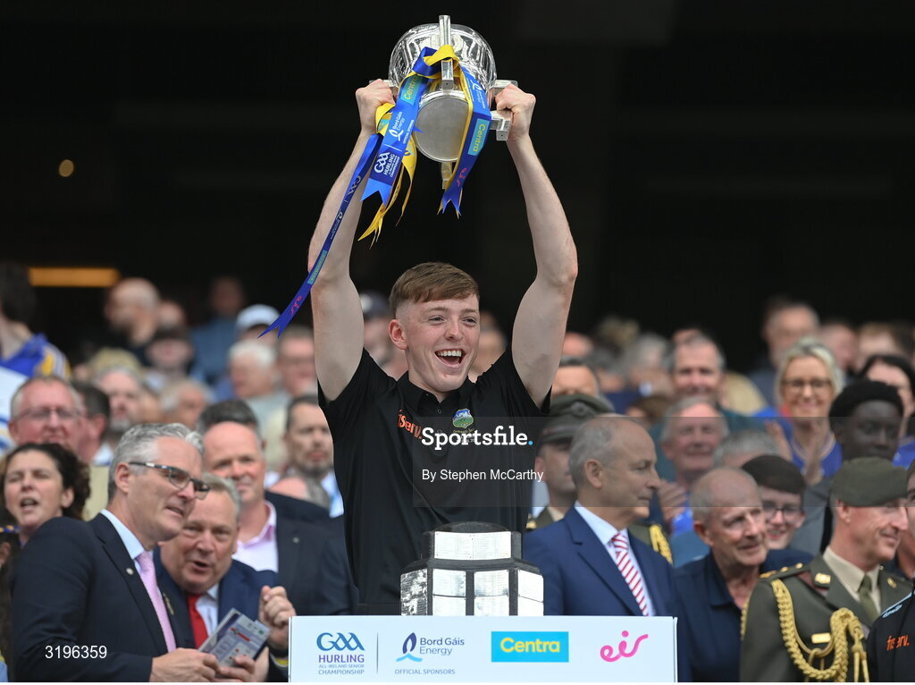 20 July 2025; Josh Keller lifts the Liam MacCarthy cup after victory in the GAA Hurling All-Ireland Senior Championship final match between Cork and Tipperary at Croke Park in Dublin. Photo by Stephen McCarthy/Sportsfile