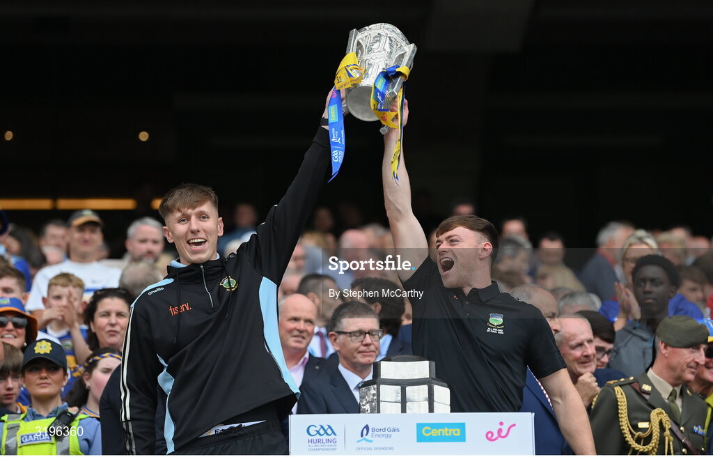 20 July 2025; Tipperary players Gearóid O'Connor, left, and Conor Bowe lift the Liam MacCarthy cup after victory in the GAA Hurling All-Ireland Senior Championship final match between Cork and Tipperary at Croke Park in Dublin. Photo by Stephen McCarthy/Sportsfile
