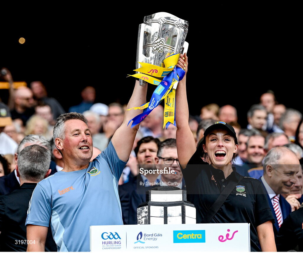 20 July 2025; Tipperary Coach / Physical Therapist Darren Cody and Nutritionist Amy McGuire lift the Liam MacCarthy Cup after the GAA Hurling All-Ireland Senior Championship final match between Cork and Tipperary at Croke Park in Dublin. Photo by Stephen McCarthy/Sportsfile