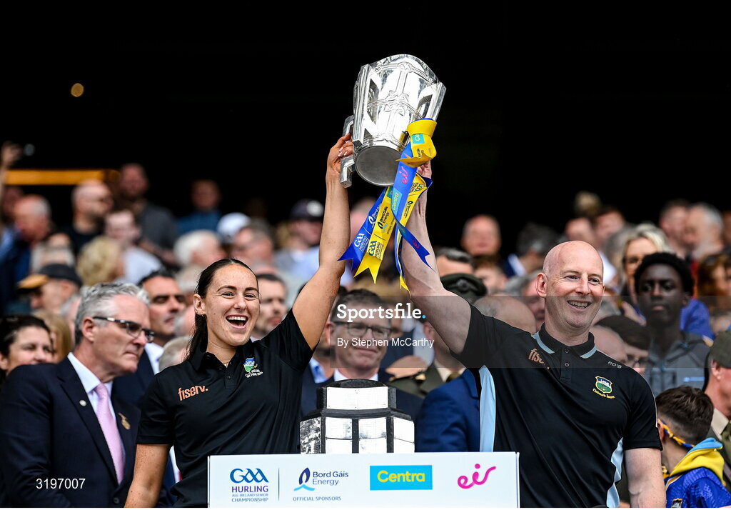 20 July 2025; Tipperary Physical Therapist Sarah Cuddy and Team Physiotherapist Paddy O'Brien lift the Liam MacCarthy Cup after the GAA Hurling All-Ireland Senior Championship final match between Cork and Tipperary at Croke Park in Dublin. Photo by Stephen McCarthy/Sportsfile
