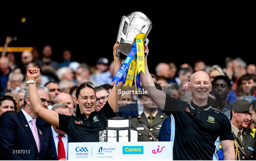 20 July 2025; Tipperary Physical Therapist Sarah Cuddy and Team Physiotherapist Paddy O'Brien lift the Liam MacCarthy Cup after the GAA Hurling All-Ireland Senior Championship final match between Cork and Tipperary at Croke Park in Dublin. Photo by Stephen McCarthy/Sportsfile