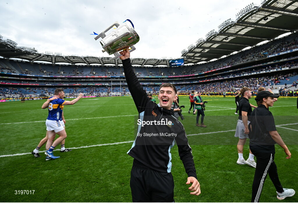 20 July 2025; Conor Martin of Tipperary celebrates with the Liam MacCarthy cup after victory in the GAA Hurling All-Ireland Senior Championship final match between Cork and Tipperary at Croke Park in Dublin. Photo by Stephen McCarthy/Sportsfile