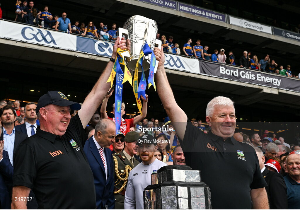 20 July 2025; Tipperary Team Liason Officer John Smith and Logistics Officor Michael Bourke lift the Liam MacCarthy Cup after the GAA Hurling All-Ireland Senior Championship final match between Cork and Tipperary at Croke Park in Dublin. Photo by Ray McManus/Sportsfile