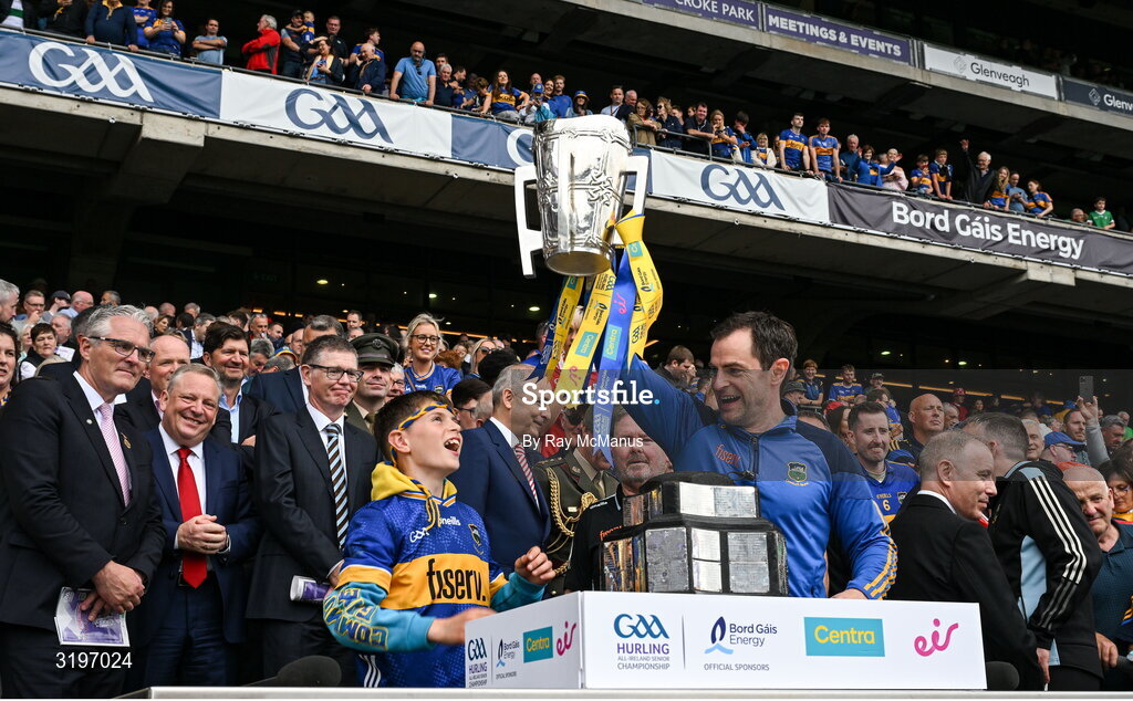 20 July 2025; Charlie and Dr Brendan Murphy of Tipperary lift the Liam MacCarthy Cup after the GAA Hurling All-Ireland Senior Championship final match between Cork and Tipperary at Croke Park in Dublin. Photo by Ray McManus/Sportsfile