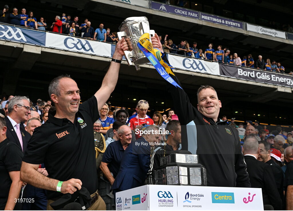 20 July 2025; Tipperary CEO Murtagh Brennan and Jonathan Cullen lift the Liam MacCarthy Cup after the GAA Hurling All-Ireland Senior Championship final match between Cork and Tipperary at Croke Park in Dublin. Photo by Ray McManus/Sportsfile