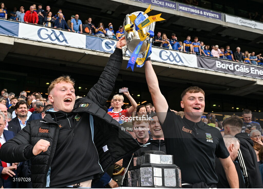 20 July 2025; Seanie Kenneally and Billy Seymour of Tipperary lift the Liam MacCarthy Cup after the GAA Hurling All-Ireland Senior Championship final match between Cork and Tipperary at Croke Park in Dublin. Photo by Ray McManus/Sportsfile