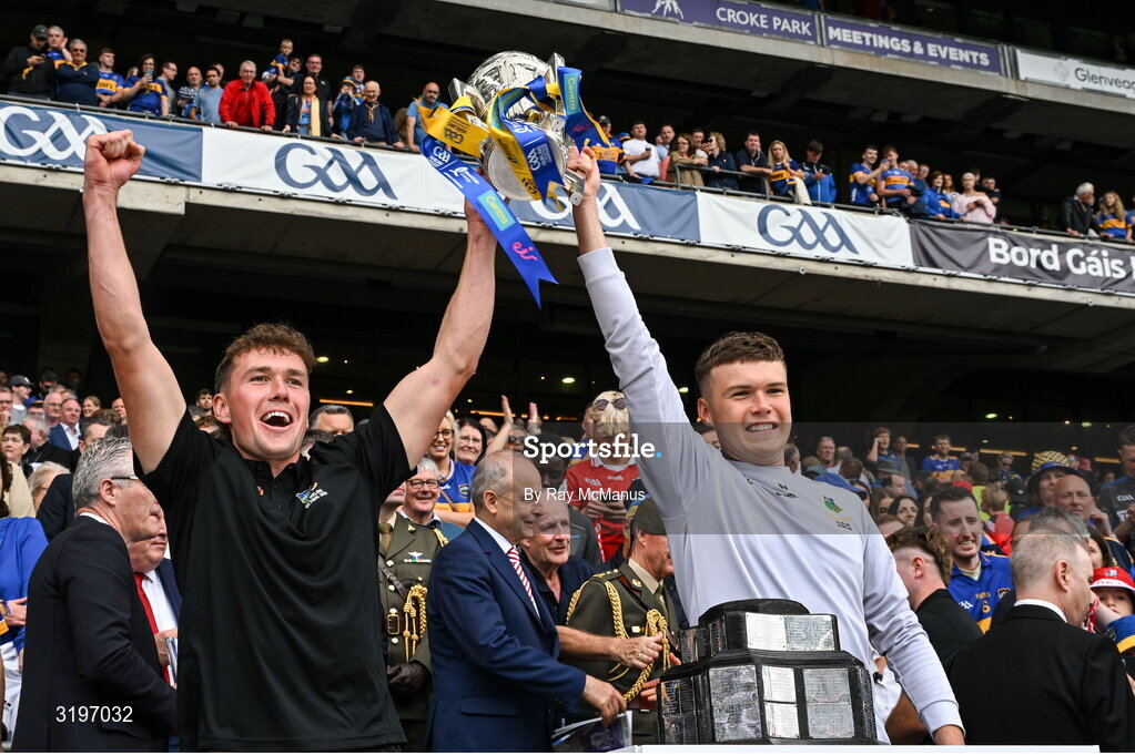 20 July 2025; Gavin and Aaron O'Halloran of Tipperary lift the Liam MacCarthy Cup after the GAA Hurling All-Ireland Senior Championship final match between Cork and Tipperary at Croke Park in Dublin. Photo by Ray McManus/Sportsfile