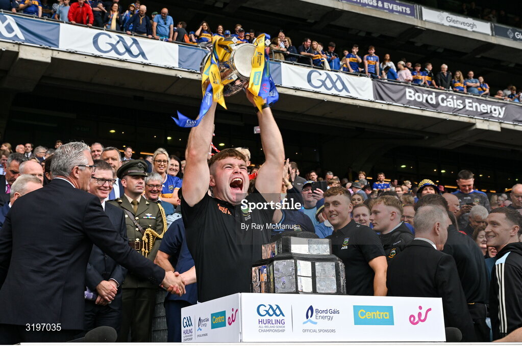20 July 2025; Danny Slattery of Tipperary lifts the Liam MacCarthy Cup after the GAA Hurling All-Ireland Senior Championship final match between Cork and Tipperary at Croke Park in Dublin. Photo by Ray McManus/Sportsfile