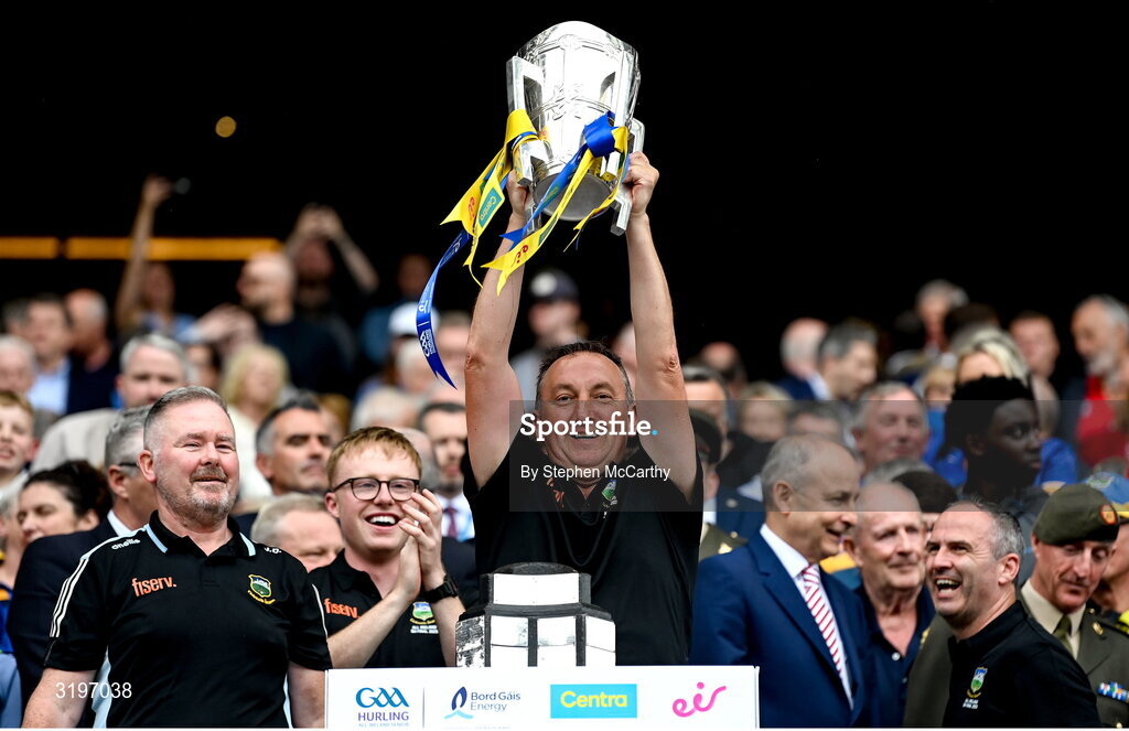 20 July 2025; Seamie Butler of Tipperary lifts the Liam MacCarthy Cup after the GAA Hurling All-Ireland Senior Championship final match between Cork and Tipperary at Croke Park in Dublin. Photo by Stephen McCarthy/Sportsfile