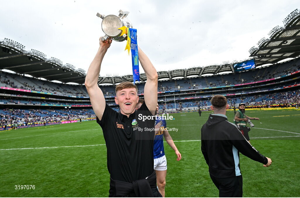20 July 2025; Josh Keller of Tipperary celebrates with the Liam MacCarthy cup after victory in the GAA Hurling All-Ireland Senior Championship final match between Cork and Tipperary at Croke Park in Dublin. Photo by Stephen McCarthy/Sportsfile