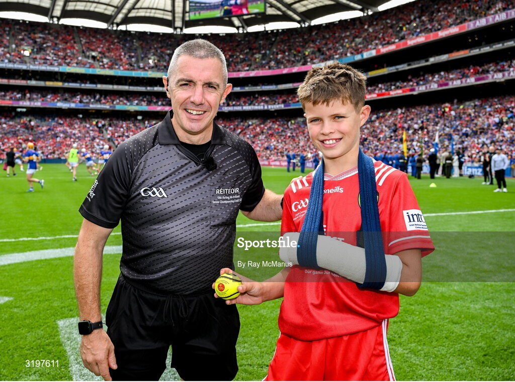 20 July 2025; Referee Liam Gordon is presented with the match ball by Ben Lynch, from Portumna, before the GAA Hurling All-Ireland Senior Championship final match between Cork and Tipperary at Croke Park in Dublin. Photo by Ray McManus/Sportsfile