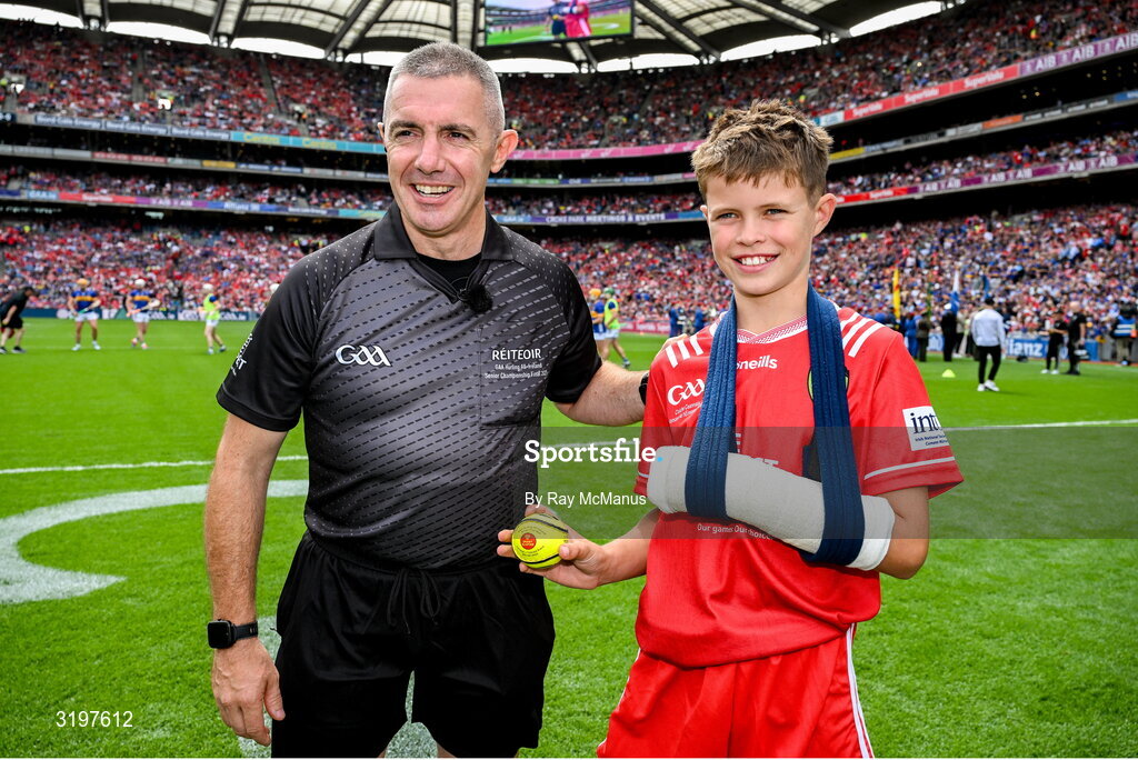 20 July 2025; Referee Liam Gordon is presented with the match ball by Ben Lynch, from Portumna, before the GAA Hurling All-Ireland Senior Championship final match between Cork and Tipperary at Croke Park in Dublin. Photo by Ray McManus/Sportsfile