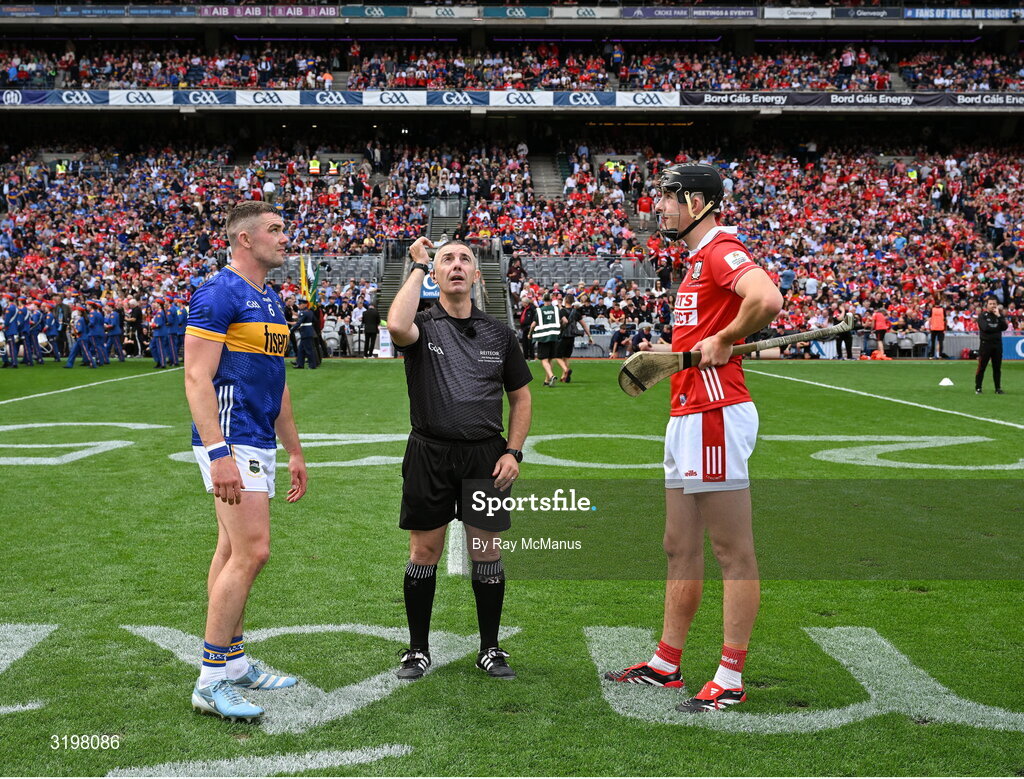 20 July 2025; The two captains, Ronan Maher of Tipperary and Robert Downey of Cork, watch as referee Liam Gordon tosses a coin before the GAA Hurling All-Ireland Senior Championship final match between Cork and Tipperary at Croke Park in Dublin. Photo by Ray McManus/Sportsfile