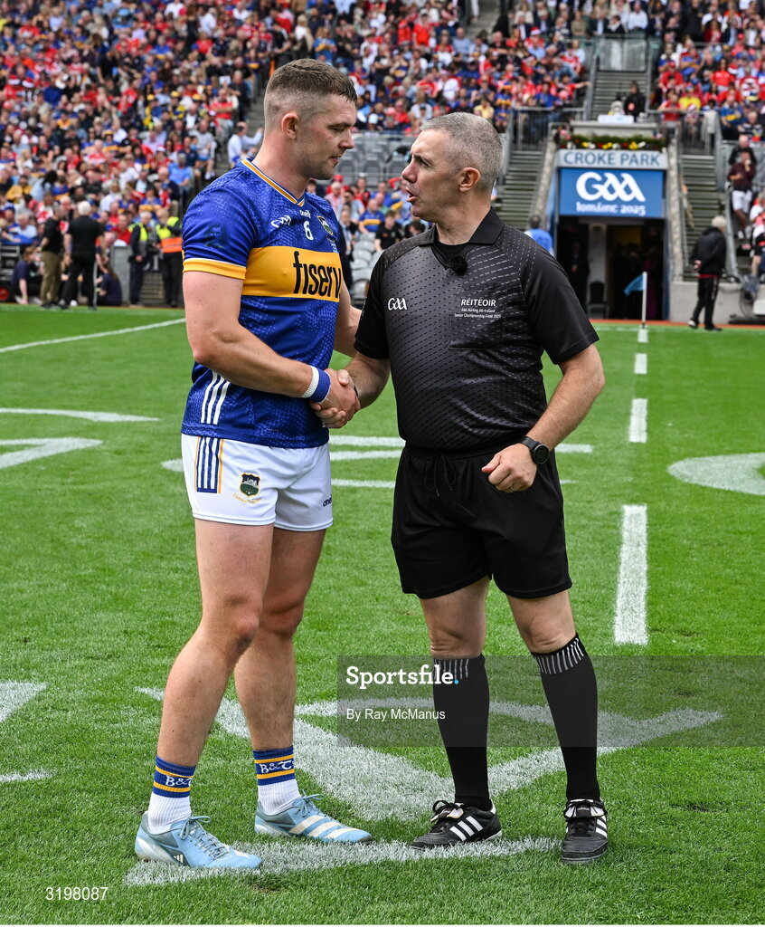 20 July 2025; Captain Ronan Maher of Tipperary shakes hands with referee Liam Gordon before the GAA Hurling All-Ireland Senior Championship final match between Cork and Tipperary at Croke Park in Dublin. Photo by Ray McManus/Sportsfile