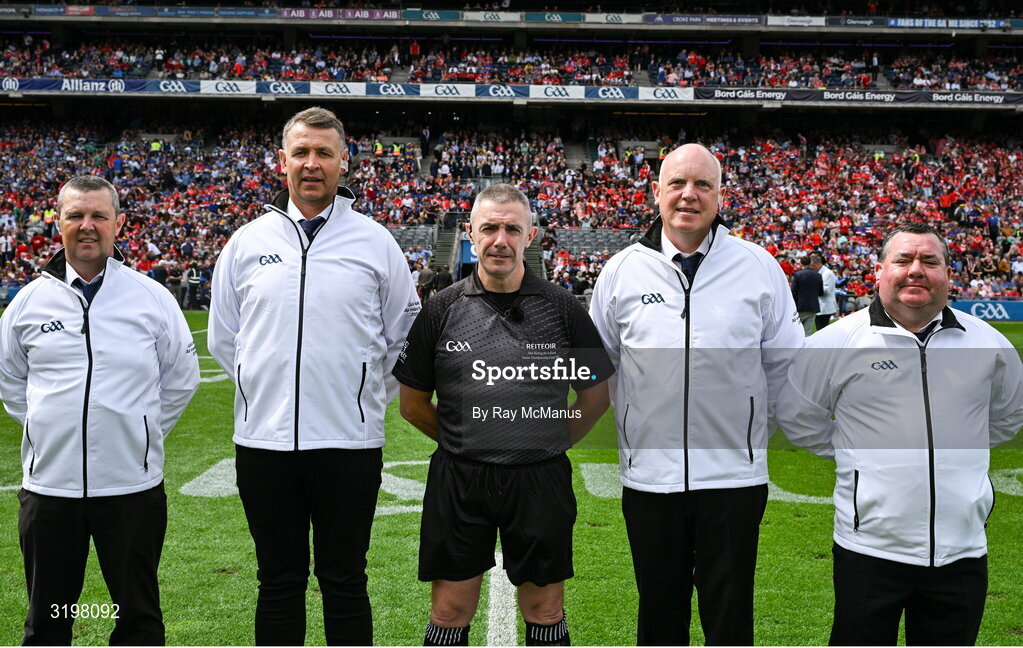 20 July 2025; Match referee referee Liam Gordon and his score umpires,Damien Gibbons, Alan McClearn, John Larkin and Ollie Reilly, before the GAA Hurling All-Ireland Senior Championship final match between Cork and Tipperary at Croke Park in Dublin. Photo by Ray McManus/Sportsfile