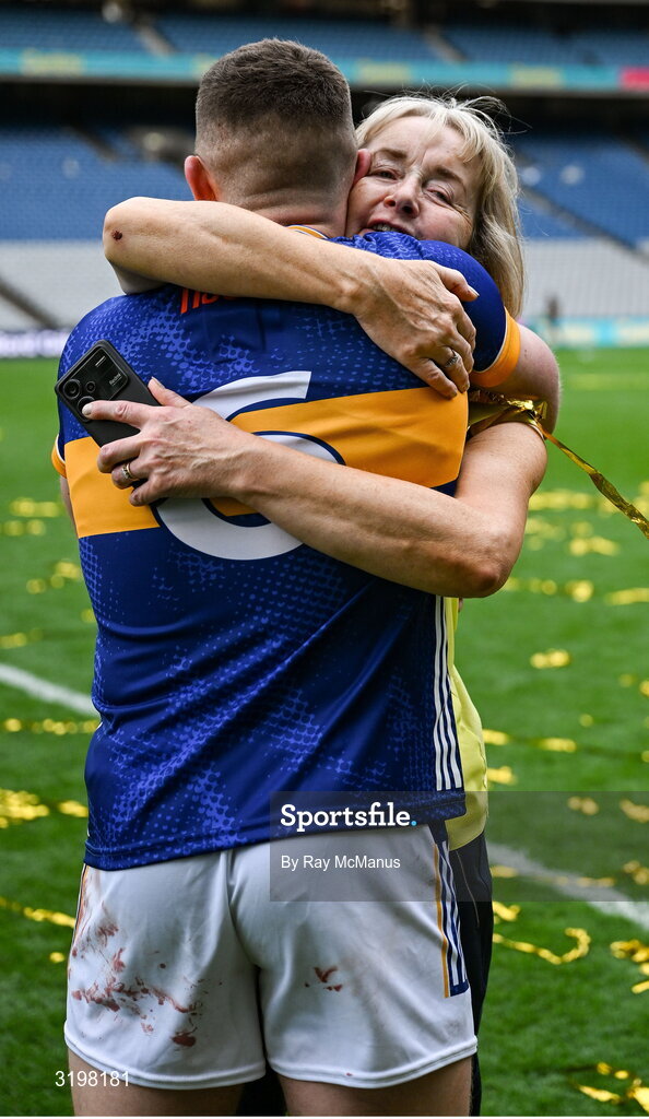20 July 2025; Ronan Maher of Tipperary and Mary McGrath after the GAA Hurling All-Ireland Senior Championship final match between Cork and Tipperary at Croke Park in Dublin. Photo by Ray McManus/Sportsfile