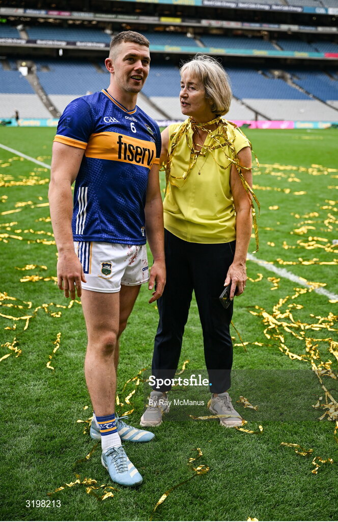 20 July 2025; Ronan Maher of Tipperary and Mary McGrath after the GAA Hurling All-Ireland Senior Championship final match between Cork and Tipperary at Croke Park in Dublin. Photo by Ray McManus/Sportsfile