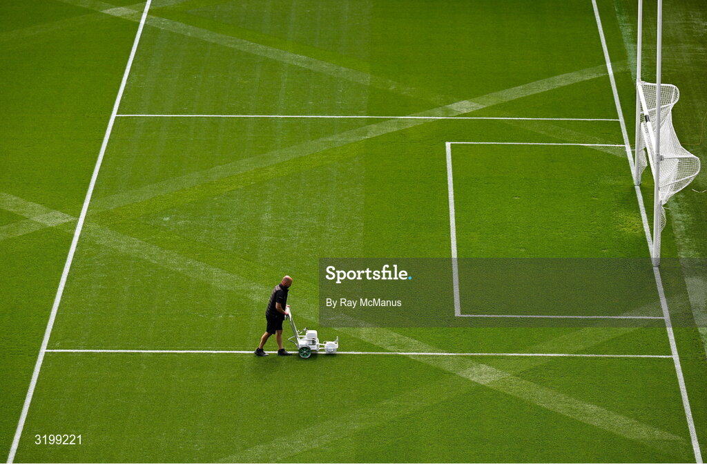 27 July 2025; Lead groundsman Darren Jepson painting the lines before the GAA Football All-Ireland Senior Championship final match between Kerry and Donegal at Croke Park in Dublin. Photo by Ray McManus/Sportsfile