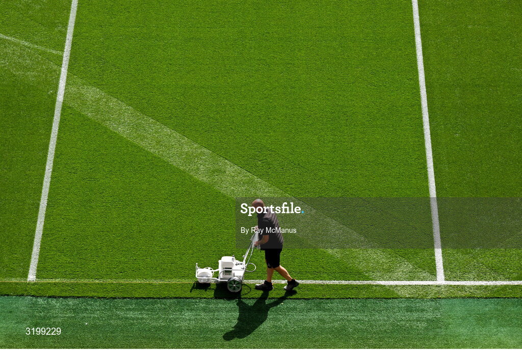 27 July 2025; Lead groundsman Darren Jepson painting the lines before the GAA Football All-Ireland Senior Championship final match between Kerry and Donegal at Croke Park in Dublin. Photo by Ray McManus/Sportsfile