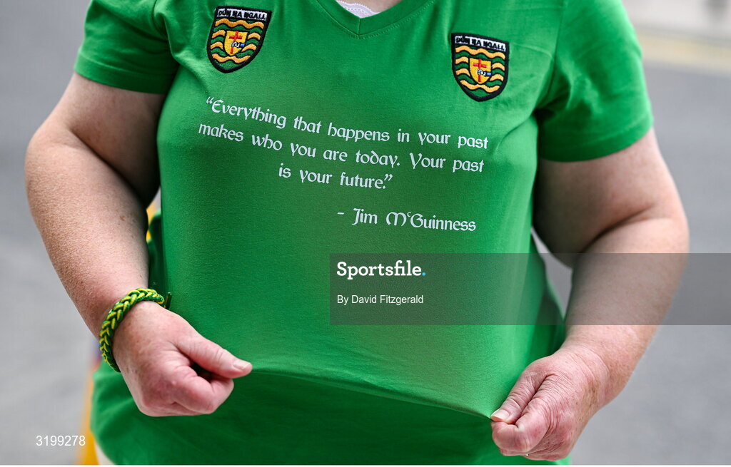 27 July 2025; A quote by Donegal manager Jim McGuinness on the t-shirt of a Donegal supporter before the GAA Football All-Ireland Senior Championship final match between Kerry and Donegal at Croke Park in Dublin. Photo by David Fitzgerald/Sportsfile