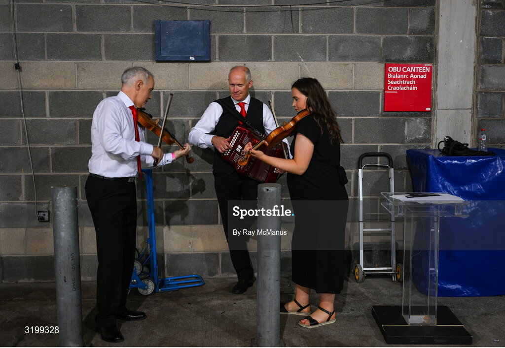 27 July 2025; Philip Duffy, left, Seán Carroll and Megan Duffy, members of the Drumcliffe / Rosses Point GAA Club, Sligo, band practice under the Hogan Stand before playing at the GAA Football All-Ireland Senior Championship final match between Kerry and Donegal at Croke Park in Dublin. Photo by Ray McManus/Sportsfile