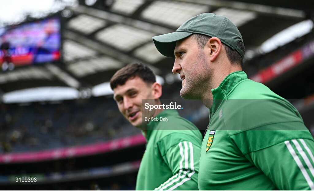 27 July 2025; Michael Murphy, right, and Michael Langan of Donegal walk the pitch before the GAA Football All-Ireland Senior Championship final match between Kerry and Donegal at Croke Park in Dublin. Photo by Seb Daly/Sportsfile