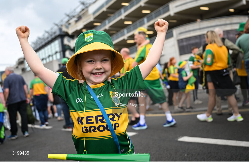 27 July 2025; Kerry supporter Ellie Kenny, age 4, from Ballyheigue, Kerry, before the GAA Football All-Ireland Senior Championship final match between Kerry and Donegal at Croke Park in Dublin. Photo by David Fitzgerald/Sportsfile