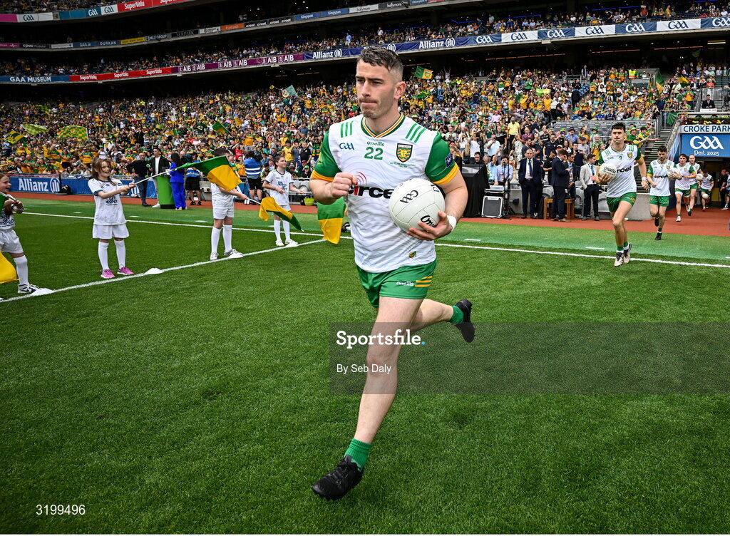 27 July 2025; Patrick McBrearty of Donegal runs onto the pitch before the GAA Football All-Ireland Senior Championship final match between Kerry and Donegal at Croke Park in Dublin. Photo by Seb Daly/Sportsfile