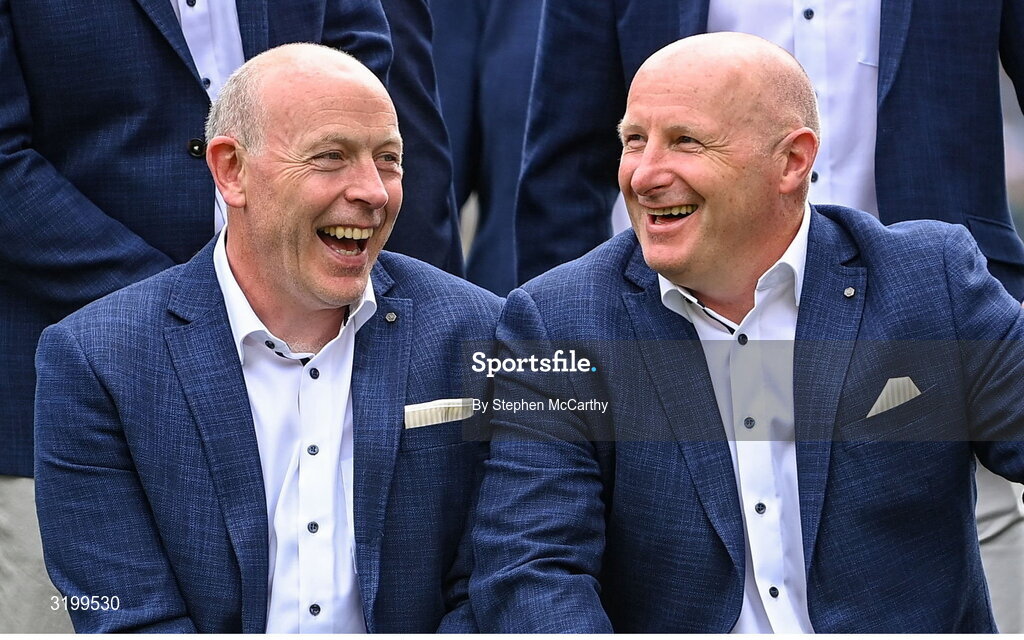 27 July 2025; Kerry Jubilee team captain Seamus Moynihan, left, and goalkeeper Declan O'Keeffe before the GAA Football All-Ireland Senior Championship final match between Kerry and Donegal at Croke Park in Dublin. Photo by Stephen McCarthy/Sportsfile