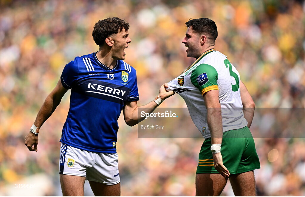 27 July 2025; David Clifford of Kerry and Brendan McCole of Donegal tussle during the GAA Football All-Ireland Senior Championship final match between Kerry and Donegal at Croke Park in Dublin. Photo by Seb Daly/Sportsfile