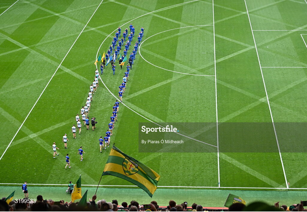 27 July 2025; The Donegal and Kerry team during the parade before the GAA Football All-Ireland Senior Championship final match between Kerry and Donegal at Croke Park in Dublin. Photo by Piaras Ó Mídheach/Sportsfile