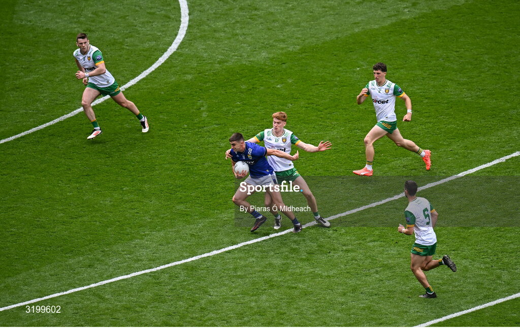 27 July 2025; Seán O'Shea of Kerry is tackled by Ciaran Moore of Donegal during the GAA Football All-Ireland Senior Championship final match between Kerry and Donegal at Croke Park in Dublin. Photo by Piaras Ó Mídheach/Sportsfile
