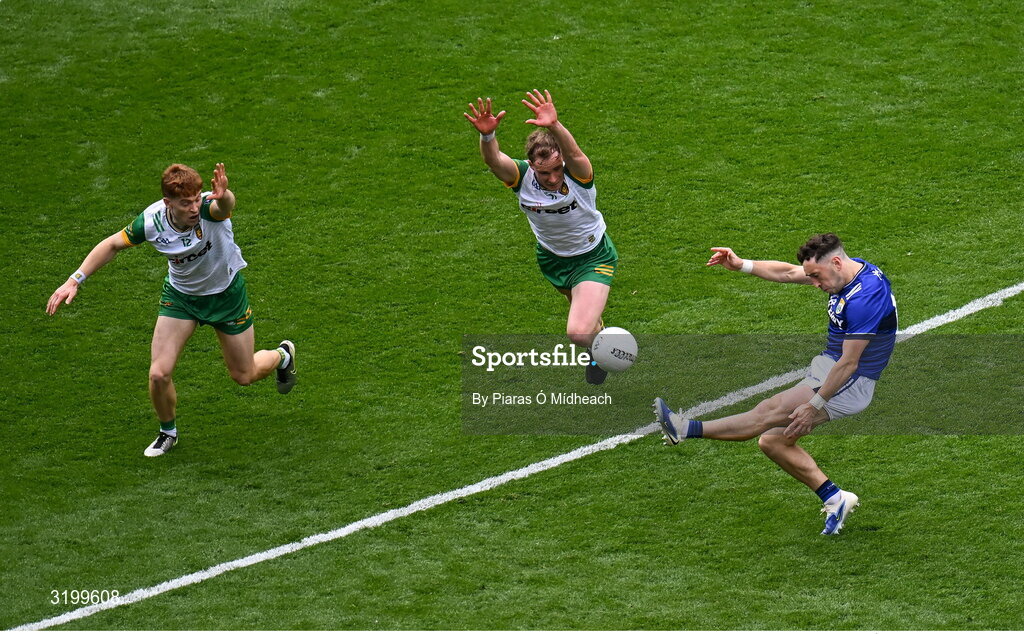 27 July 2025; Paudie Clifford of Kerry kicks a two point score ahead of Ciaran Moore, left, and Ciaran Thompson of Donegal during the GAA Football All-Ireland Senior Championship final match between Kerry and Donegal at Croke Park in Dublin. Photo by Piaras Ó Mídheach/Sportsfile