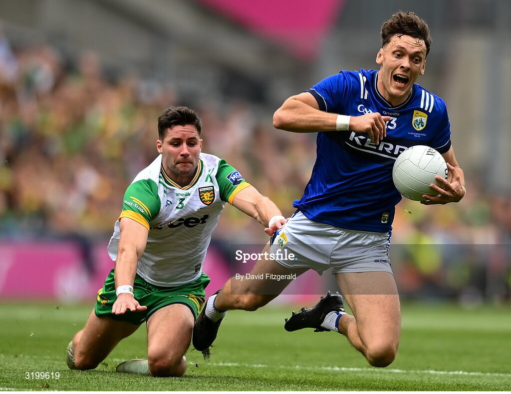 27 July 2025; David Clifford of Kerry in action against Brendan McCole of Donegal during the GAA Football All-Ireland Senior Championship final match between Kerry and Donegal at Croke Park in Dublin. Photo by David Fitzgerald/Sportsfile