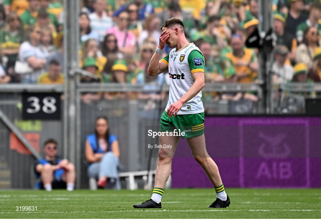 27 July 2025; Ciaran Thompson of Donegal leaves the pitch to receive medical treatment during the GAA Football All-Ireland Senior Championship final match between Kerry and Donegal at Croke Park in Dublin. Photo by Seb Daly/Sportsfile