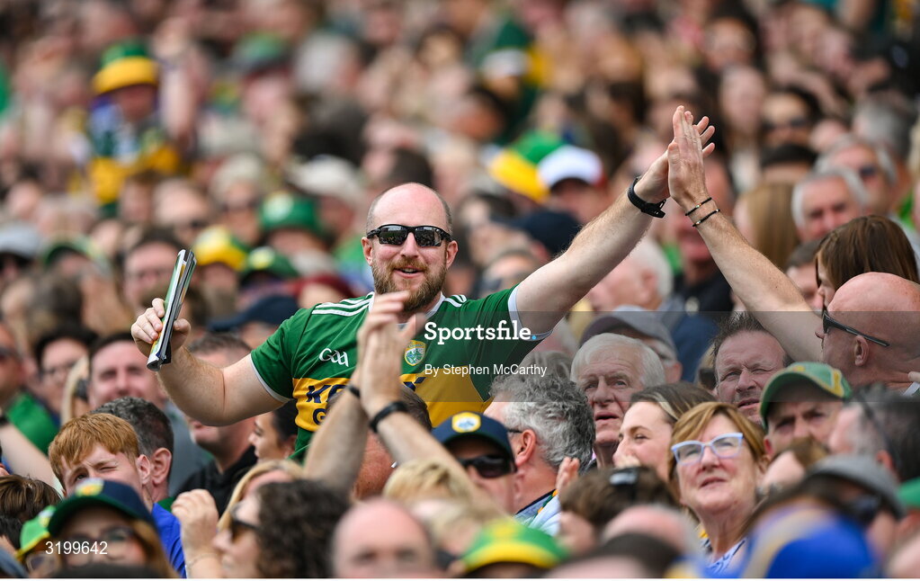 27 July 2025; A Kerry supporter celebrates a score during the GAA Football All-Ireland Senior Championship final match between Kerry and Donegal at Croke Park in Dublin. Photo by Stephen McCarthy/Sportsfile