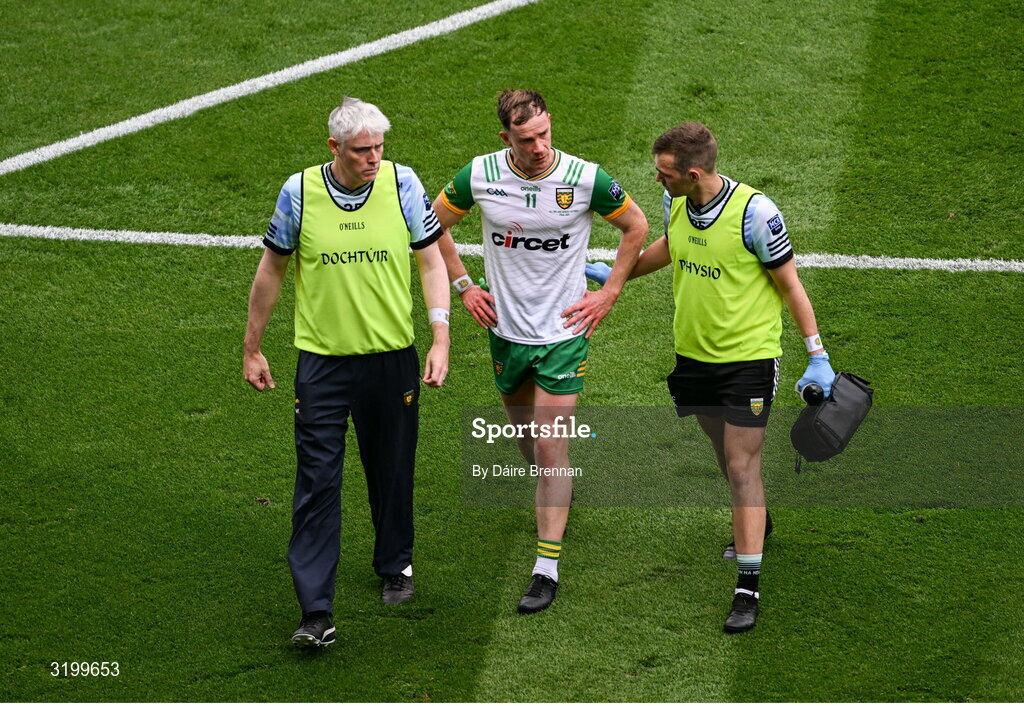 27 July 2025; Ciaran Thompson of Donegal leaves the pitch with an injury during the GAA Football All-Ireland Senior Championship final match between Kerry and Donegal at Croke Park in Dublin. Photo by Dáire Brennan/Sportsfile