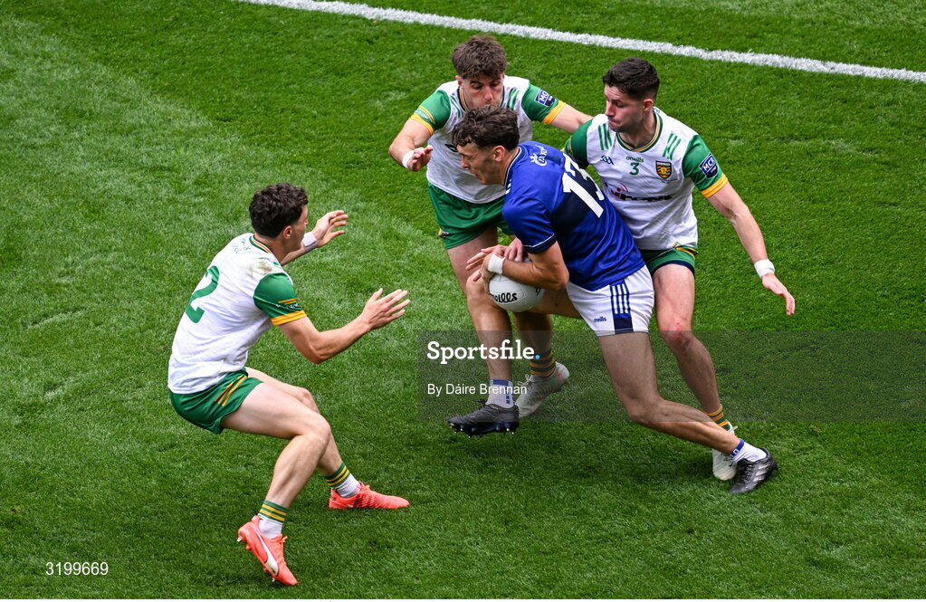 27 July 2025; David Clifford of Kerry in action against Donegal players, from left, Finnbarr Roarty, Dáire Ó Baoill and Brendan McCole during the GAA Football All-Ireland Senior Championship final match between Kerry and Donegal at Croke Park in Dublin. Photo by Daire Brennan/Sportsfile