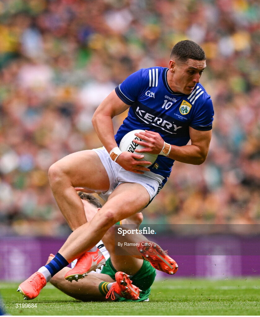 27 July 2025; Joe O'Connor of Kerry in action against Finnbarr Roarty of Donegal during the GAA Football All-Ireland Senior Championship final match between Kerry and Donegal at Croke Park in Dublin. Photo by Ramsey Cardy/Sportsfile