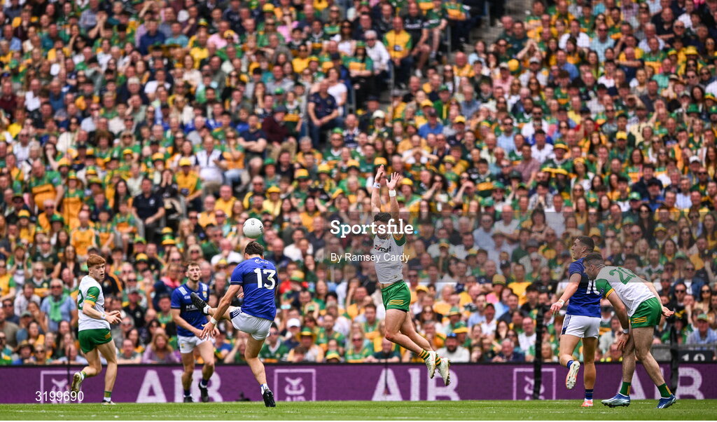 27 July 2025; David Clifford of Kerry kicks under pressure from Brendan McCole of Donegal during the GAA Football All-Ireland Senior Championship final match between Kerry and Donegal at Croke Park in Dublin. Photo by Ramsey Cardy/Sportsfile