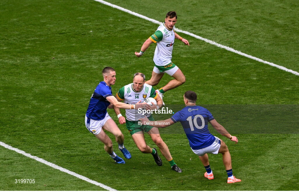 27 July 2025; Michael Murphy of Donegal in action against Kerry players Jason Foley, left, and Joe O'Connor during the GAA Football All-Ireland Senior Championship final match between Kerry and Donegal at Croke Park in Dublin. Photo by Daire Brennan/Sportsfile
