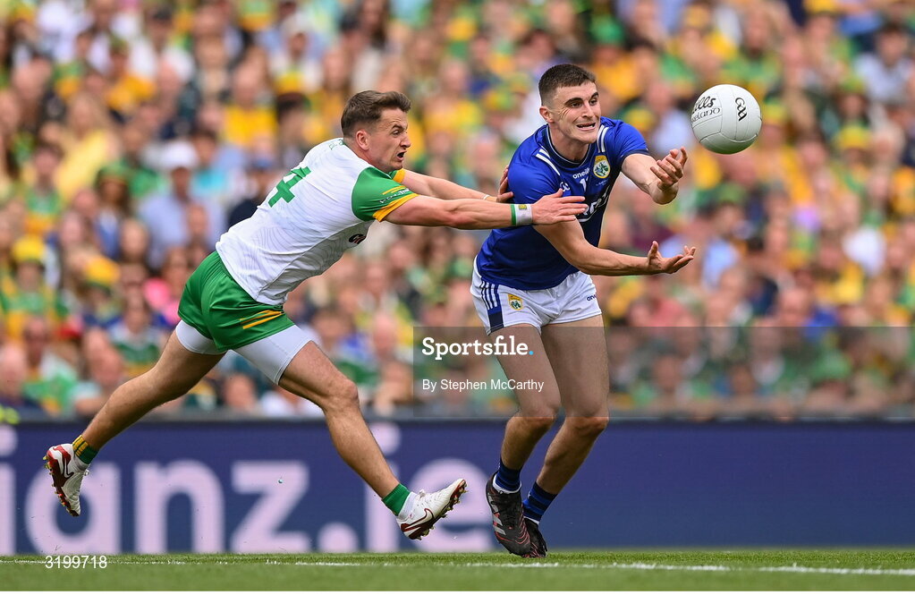 27 July 2025; Seán O'Shea of Kerry in action against Peadar Mogan of Donegal during the GAA Football All-Ireland Senior Championship final match between Kerry and Donegal at Croke Park in Dublin. Photo by Stephen McCarthy/Sportsfile