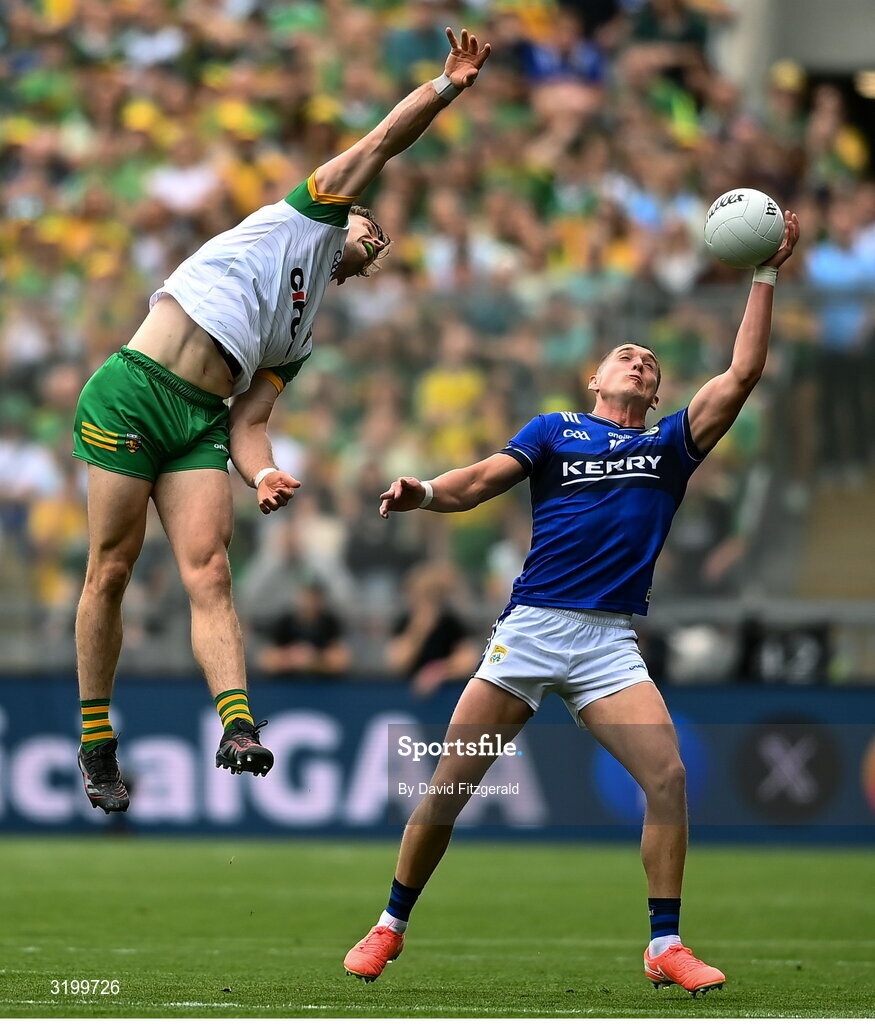 27 July 2025; Hugh McFadden of Donegal in action against Joe O'Connor of Kerry during the GAA Football All-Ireland Senior Championship final match between Kerry and Donegal at Croke Park in Dublin. Photo by David Fitzgerald/Sportsfile