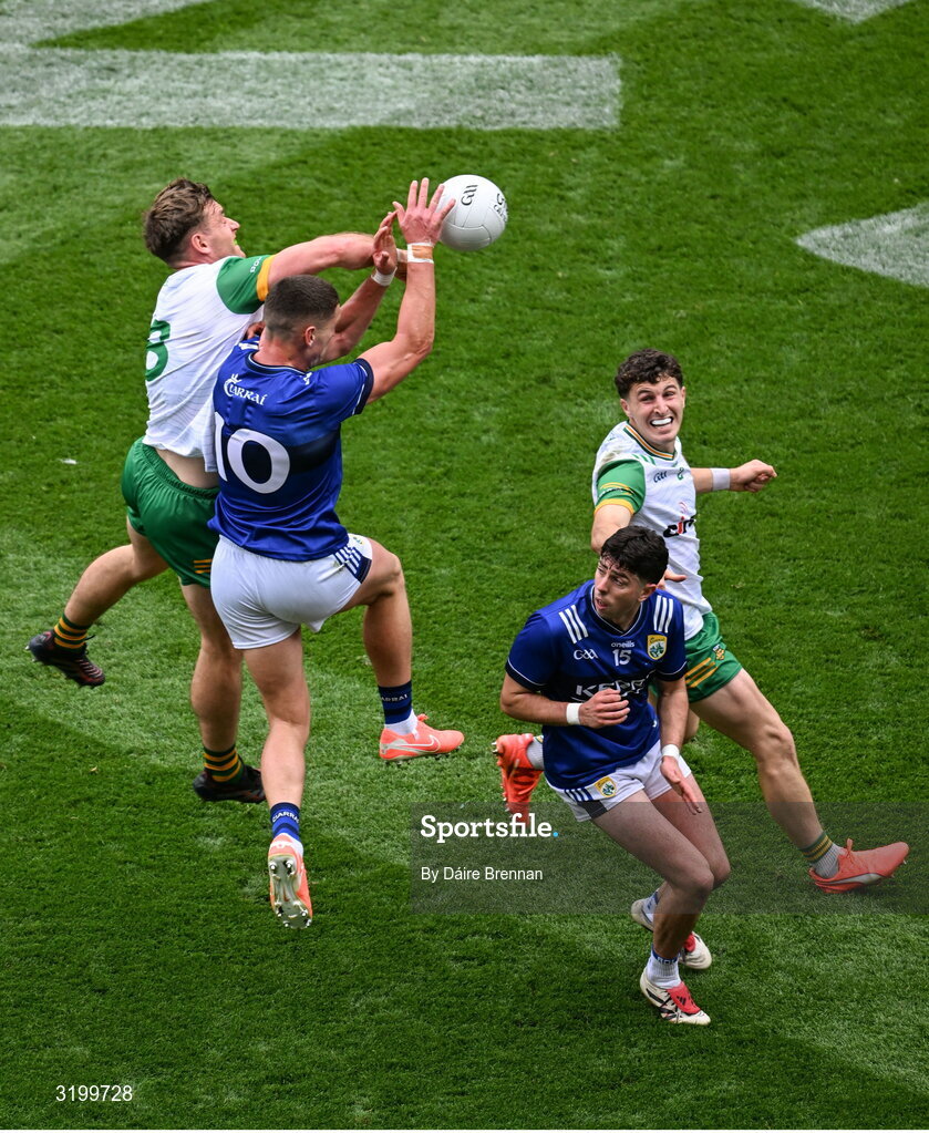 27 July 2025; Odhran McFadden Ferry of Donegal in action against Joe O'Connor of Kerry during the GAA Football All-Ireland Senior Championship final match between Kerry and Donegal at Croke Park in Dublin. Photo by Daire Brennan/Sportsfile