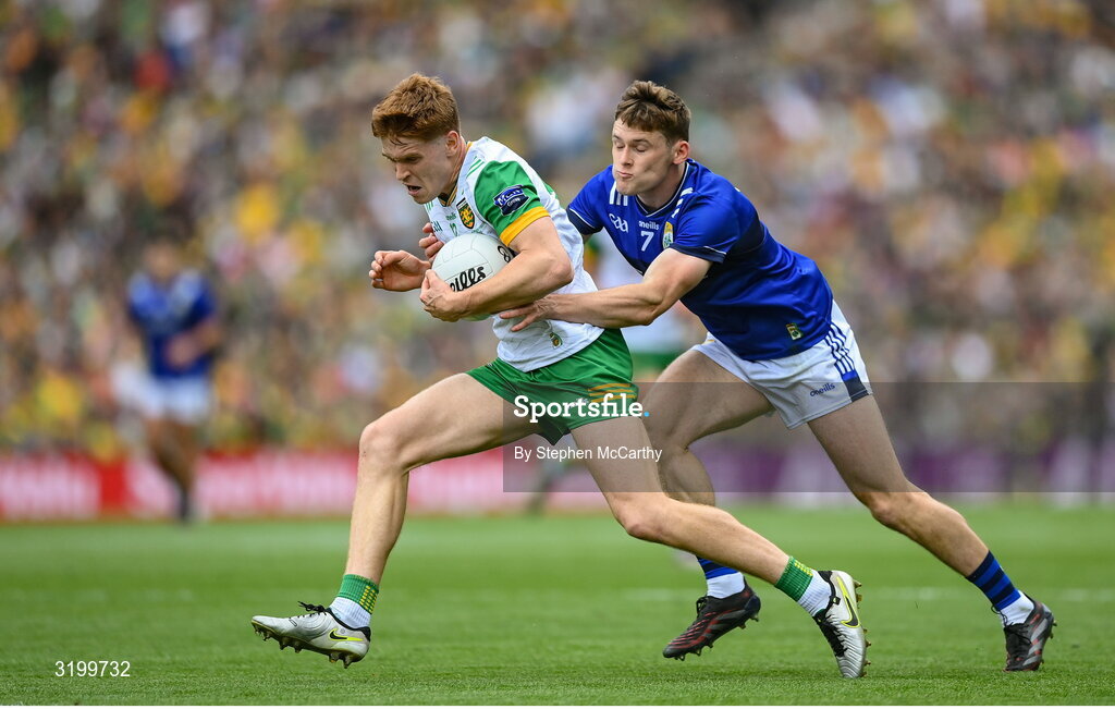 27 July 2025; Ciaran Moore of Donegal in action against Gavin White of Kerry during the GAA Football All-Ireland Senior Championship final match between Kerry and Donegal at Croke Park in Dublin. Photo by Stephen McCarthy/Sportsfile