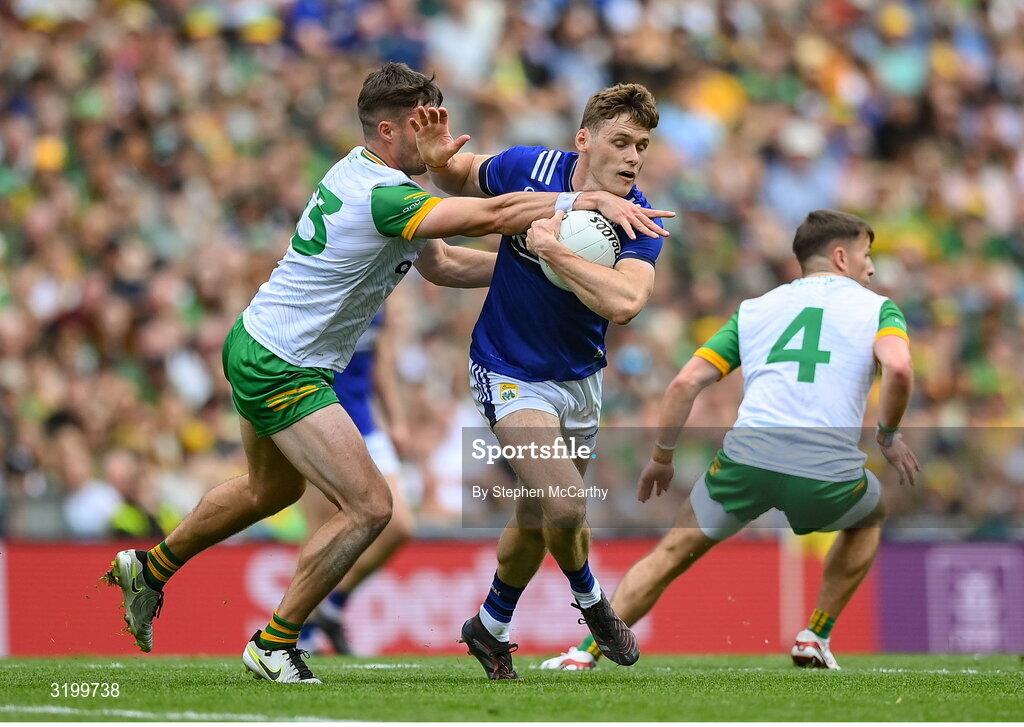 27 July 2025; Gavin White of Kerry is tackled by Conor O'Donnell of Donegal during the GAA Football All-Ireland Senior Championship final match between Kerry and Donegal at Croke Park in Dublin. Photo by Stephen McCarthy/Sportsfile