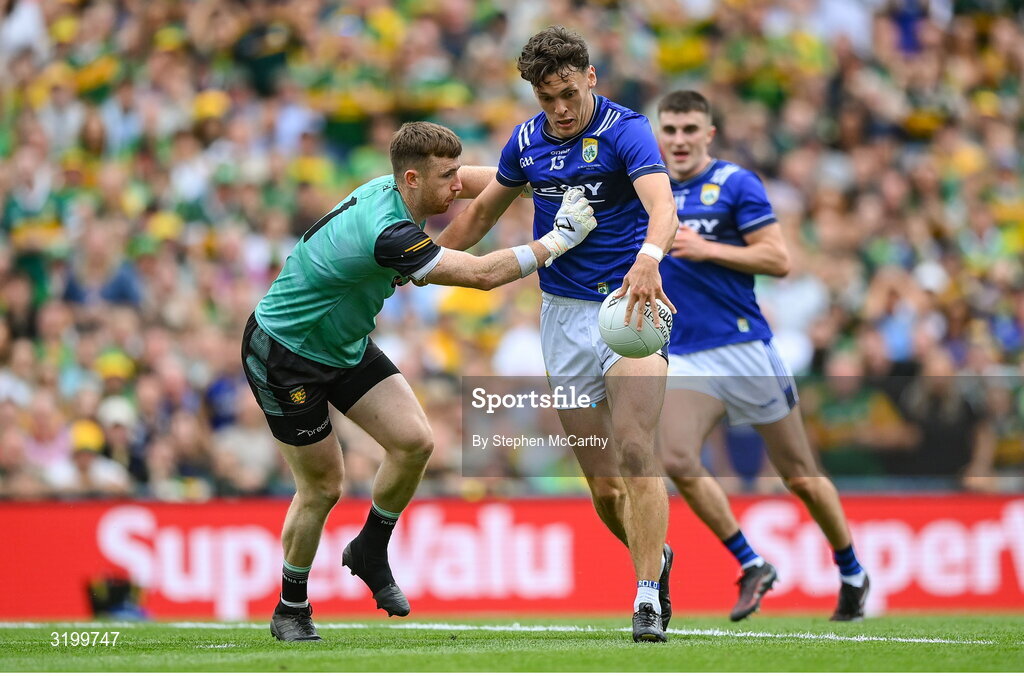 27 July 2025; David Clifford of Kerry in action against Donegal goalkeeper Shaun Patton during the GAA Football All-Ireland Senior Championship final match between Kerry and Donegal at Croke Park in Dublin. Photo by Stephen McCarthy/Sportsfile