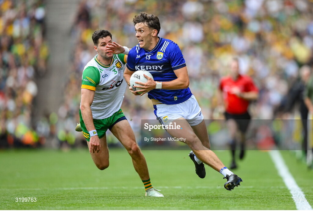 27 July 2025; David Clifford of Kerry in action against Brendan McCole of Donegal during the GAA Football All-Ireland Senior Championship final match between Kerry and Donegal at Croke Park in Dublin. Photo by Stephen McCarthy/Sportsfile