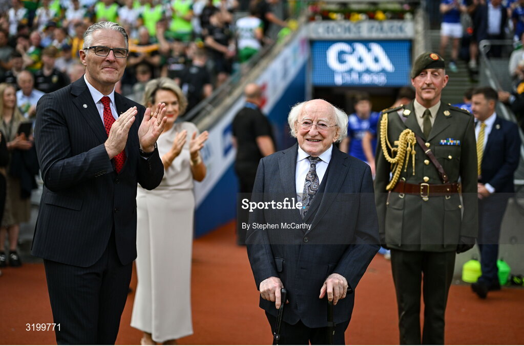 27 July 2025; President of Ireland Michael D Higgins, right, and Uachtarán Chumann Lúthchleas Gael Jarlath Burns before the GAA Football All-Ireland Senior Championship final match between Kerry and Donegal at Croke Park in Dublin. Photo by Stephen McCarthy/Sportsfile